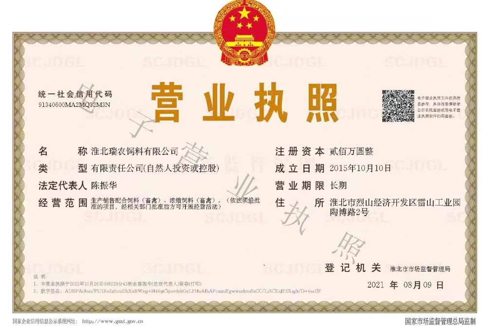 淮北瑞農(nóng)飼料有限公司占地面積12000㎡,是國(guó)家農(nóng)業(yè)部批準(zhǔn)的,生產(chǎn)豬、雞、鵝濃縮料、全價(jià)料為主產(chǎn)品的技術(shù)企業(yè)。